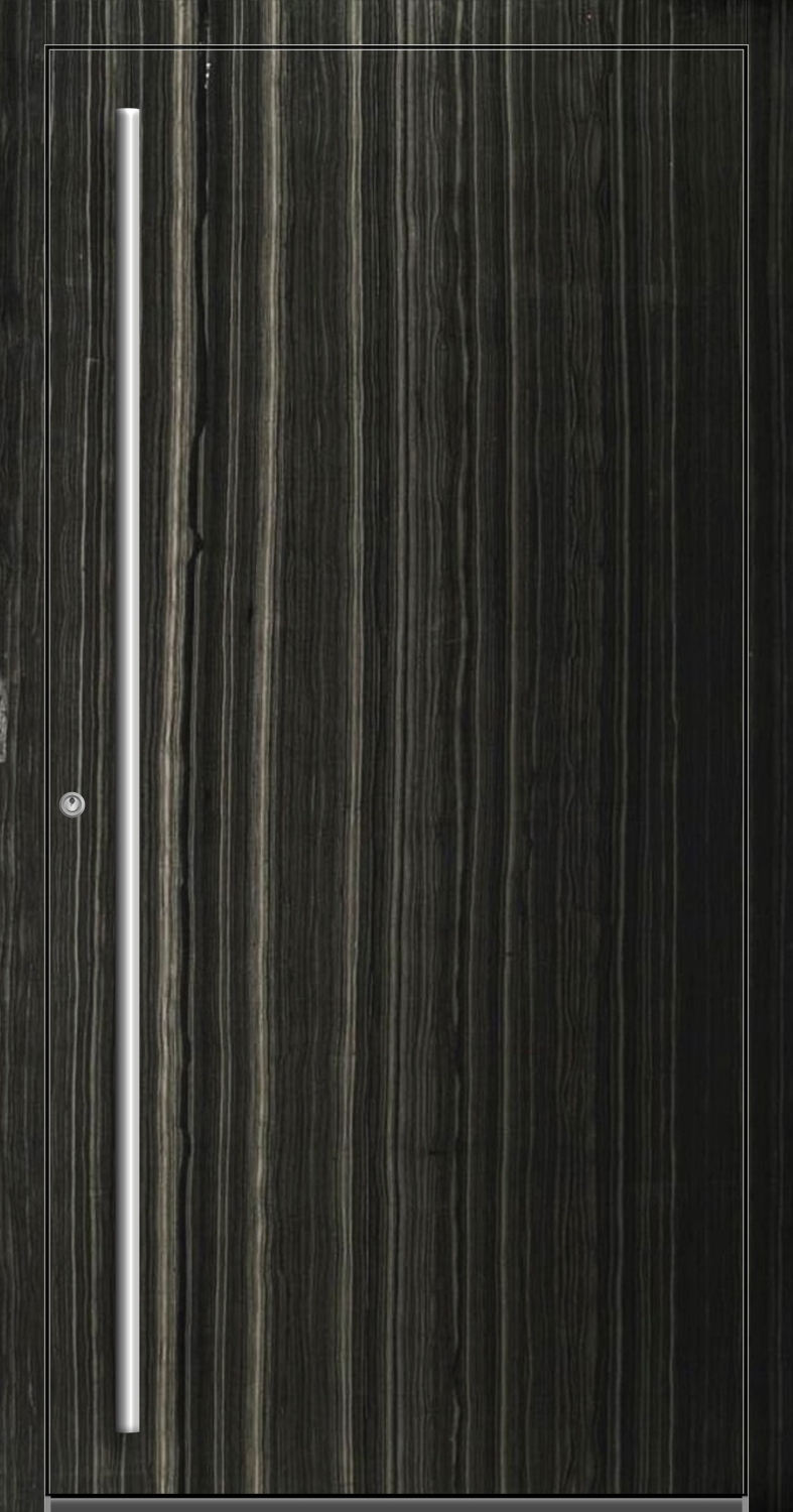 Erleben Sie die Faszination echter Steinhaustüren – gefertigt aus hochwertigem Aluminium mit einer polierten Oberfläche aus edlem Naturstein Elegant Black (gestreift). Die Textur geologische Schichtungen und erzeugt dadurch einen ganz speziellen Hauseingang. Unser Modell Aluminium-Stein Haustür "VALERIA" 83 mm RC2 ELEGANT BLACK (gestreift) wird individuell und zentimetergenau nach Maß gefertigt und vereint modernste Pirnar-Technologie mit dem PREMIUM CarbonCore-Profilsystem und handwerklicher Perfektion Made in Germany. Die Kombination aus robuster Aluminiumkonstruktion und natürlicher Steinveredelung schafft eine Haustür, die in Design, Qualität und Beständigkeit Maßstäbe setzt. Der integrierte Obertürschließer sorgt für eine gleichmäßige Schließbewegung und erhöht die Langlebigkeit der Beschläge. Dank der innovativen Mehrkammer-Bauweise und hochwertigen Dichtungssysteme bietet sie zudem eine erstklassige Wärmedämmung mit 0,75 W/m²K und trägt so aktiv zur Energieeffizienz Ihres Hauses bei. Wählen Sie zwischen einer beidseitigen Steinverkleidung oder einer Variante mit Naturstein nur auf der Außenseite, während für die Innenseite verschiedene RAL-Farben zur Auswahl stehen. Der Naturstein Elegant Black (gestreift) verleiht jeder Tür eine Modernität, Dynamik und gleichzeitig Beständigkeit. Die Präzise Fertigung sorgt für perfekte Linien, flächenbündiges Design und eine nahtlose Oberfläche. Ein massiver Stoßgriff ist inklusive und unterstreicht den eleganten Charakter, verdeckt liegende Bänder sorgen für eine klare, puristische Optik. Optional ist die Tür mit Fingerscanner oder APP-Steuerung erhältlich – für modernen Komfort und Smart-Home-Kompatibilität. Die Oberfläche ist extrem widerstandsfähig gegen UV-Strahlung, Kratzer und Witterungseinflüsse und bleibt dauerhaft makellos – ohne Nachversiegelung oder Pflegeaufwand. Für ausgezeichneten Einbruchschutz stehen verschiedene Verriegelungen zur Wahl: 3-fach oder 5-fach Schwenkhakenverriegelung, wahlweise mechanisch oder elektrisch mit Automatikschloss. Jede Steinhaustür ist ein Unikat – mit Liebe zum Detail gefertigt und geschaffen für einen exklusiven, langlebigen Eingangsbereich.