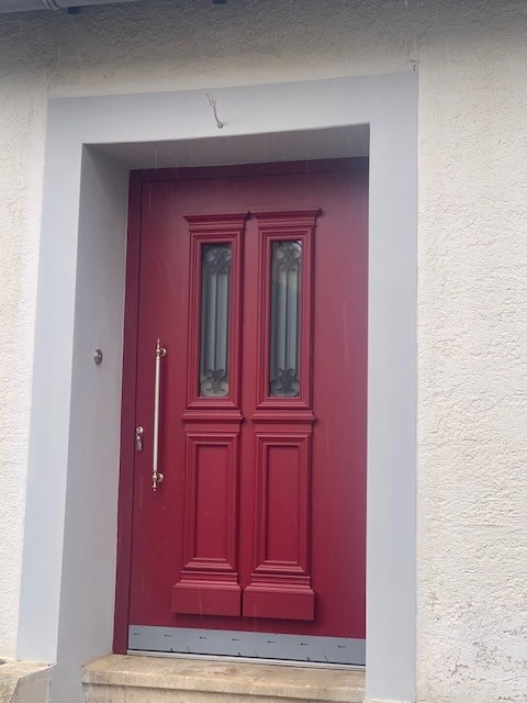 Aluminium Landhaustür flügelüberdeckend RC2 in Kundenmaß und Wunsch-RAL-Farbe Purpurrot RAL 3004